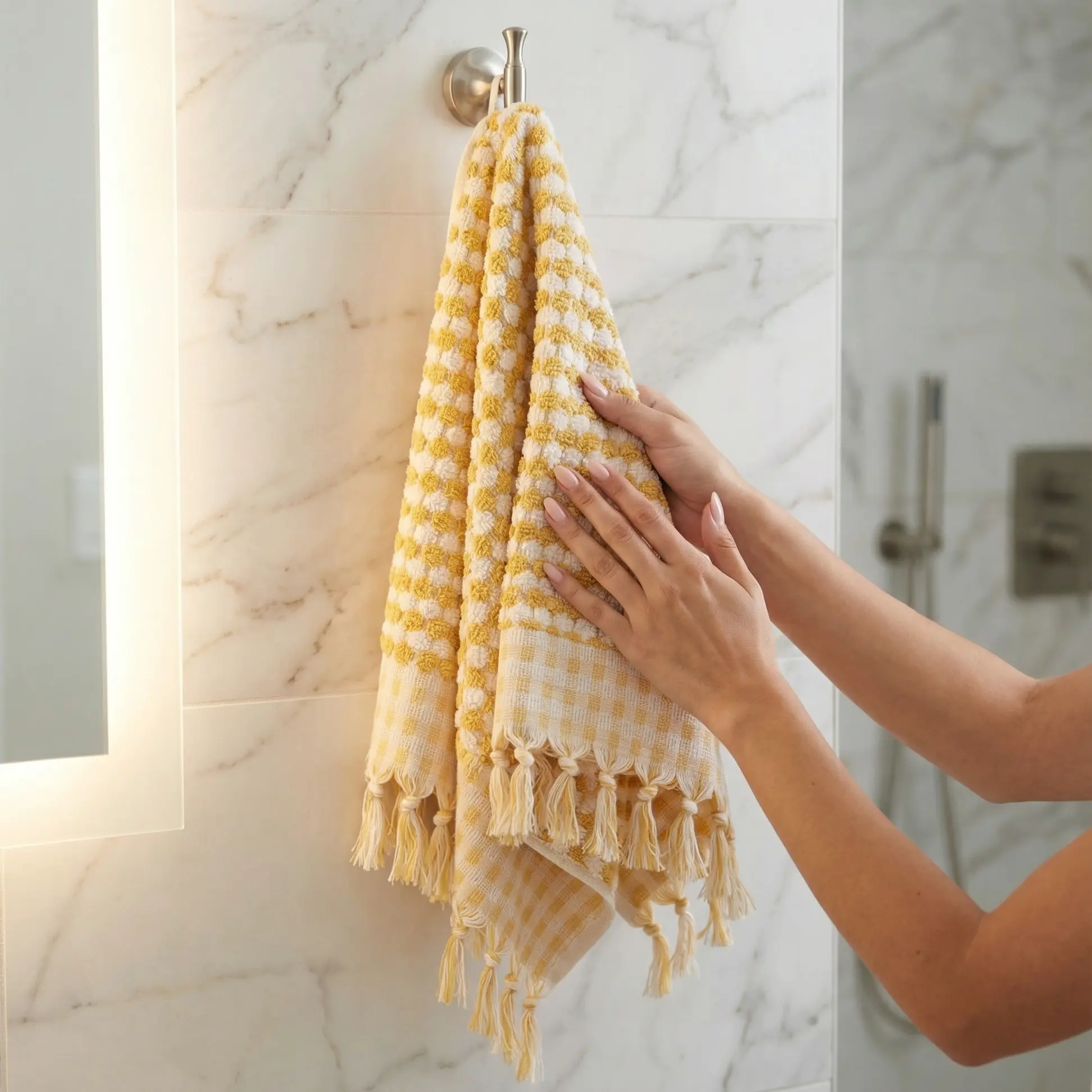Bubble Design towels are hand made by traditional loom workshops using premium cotton. The fringes are beautifully hand twisted. Ideal for lovers of elegant design and a fashionable touch in the bathroom.